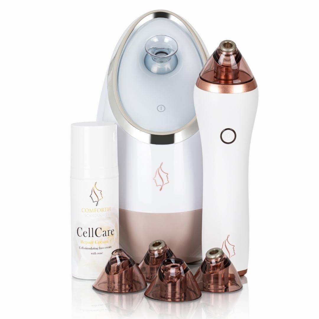 Varmt vatten på ansiktshuden hjälper till att slappna av huden och öppna porerna, så att de lättare kan rengöras från smuts, talg och bakterier. Ånga, med sin högre temperatur, fungerar ännu bättre än varmt vatten och kommer också att få dig att slappna av och må bra före sänggåendet. Du kan med fördel använda vår Nanojonisk Ansiktsångare, som också ingår i spapaketet.