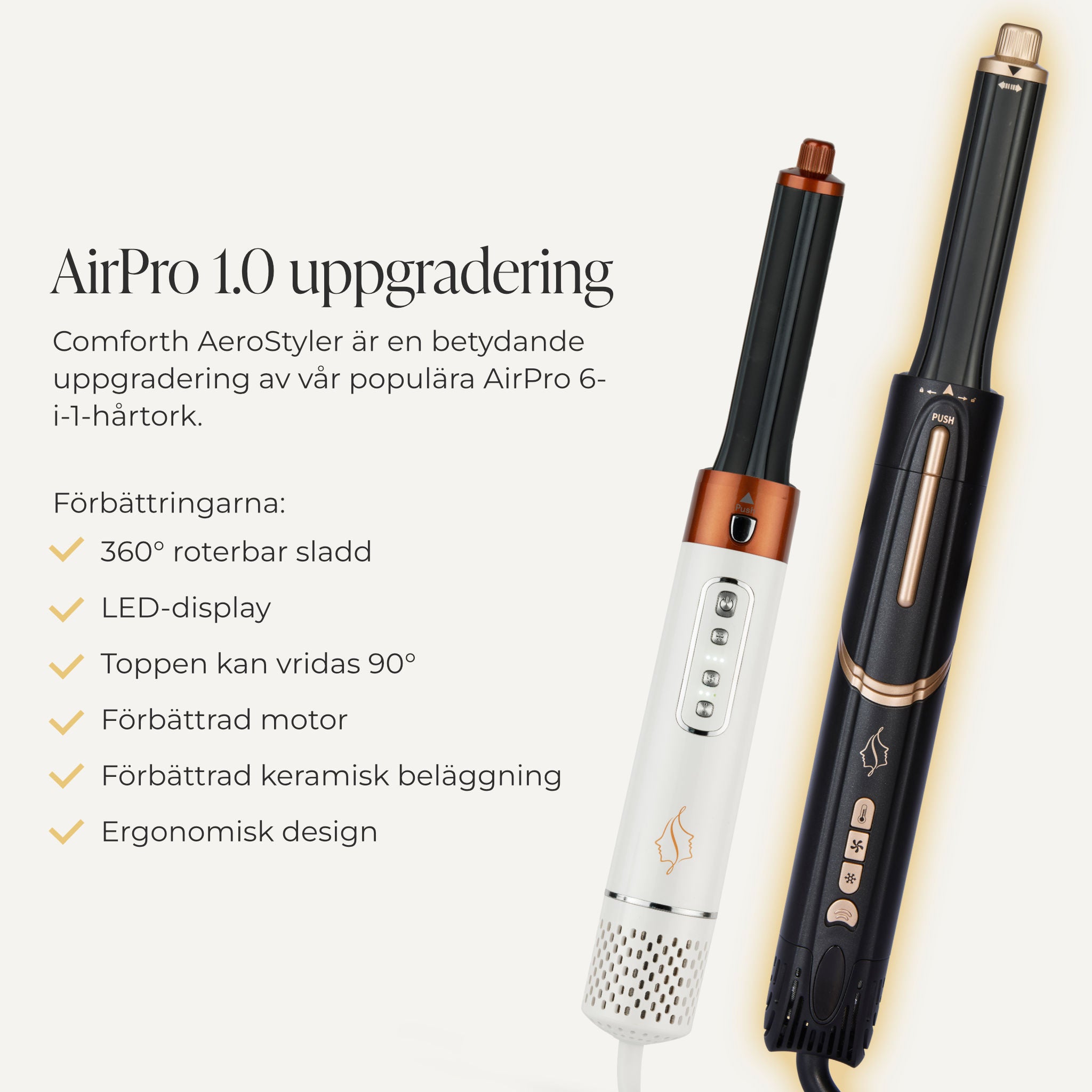 Comforth AeroStyler är en tydlig uppgradering av den populära AirPro. Med en smalare och mer ergonomisk design, LED-display, roterbart toppstycke och 360° roterbar sladd får du en enklare och mer precis stylingupplevelse. Motorn har förbättrats för längre livslängd, och både locktången och borsthuvudena har uppgraderats med starkare, antistatiska material. AeroStyler är för dig som vill ha det bästa när det gäller funktion, komfort och hållbarhet.
