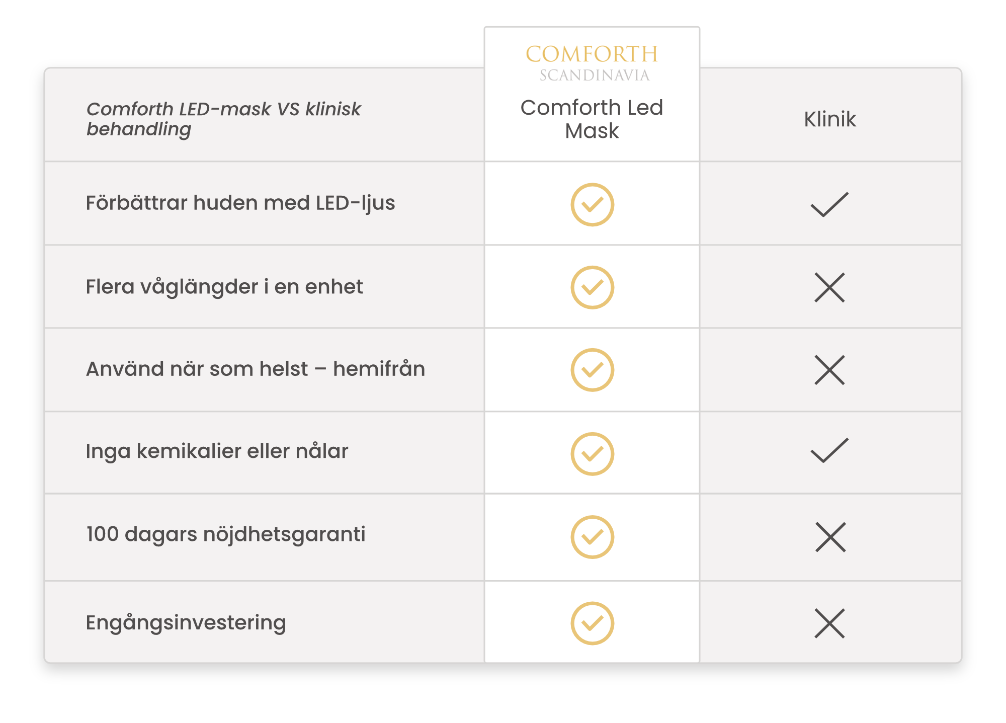 Klinisk ljusterapi kräver ofta många behandlingar utspridda över veckor eller månader – och kostar vanligtvis 500–1.200 kr per gång. Dessutom måste du boka tid, ta dig dit och ofta betala extra för kombinerade ljusspektra. Med Comforth Light Pro får du samma typ av behandling med fem olika ljusfunktioner – hemma i din egen soffa. En engångsbetalning ger dig obegränsad tillgång till hudförbättring, utan att kompromissa med kvaliteten.