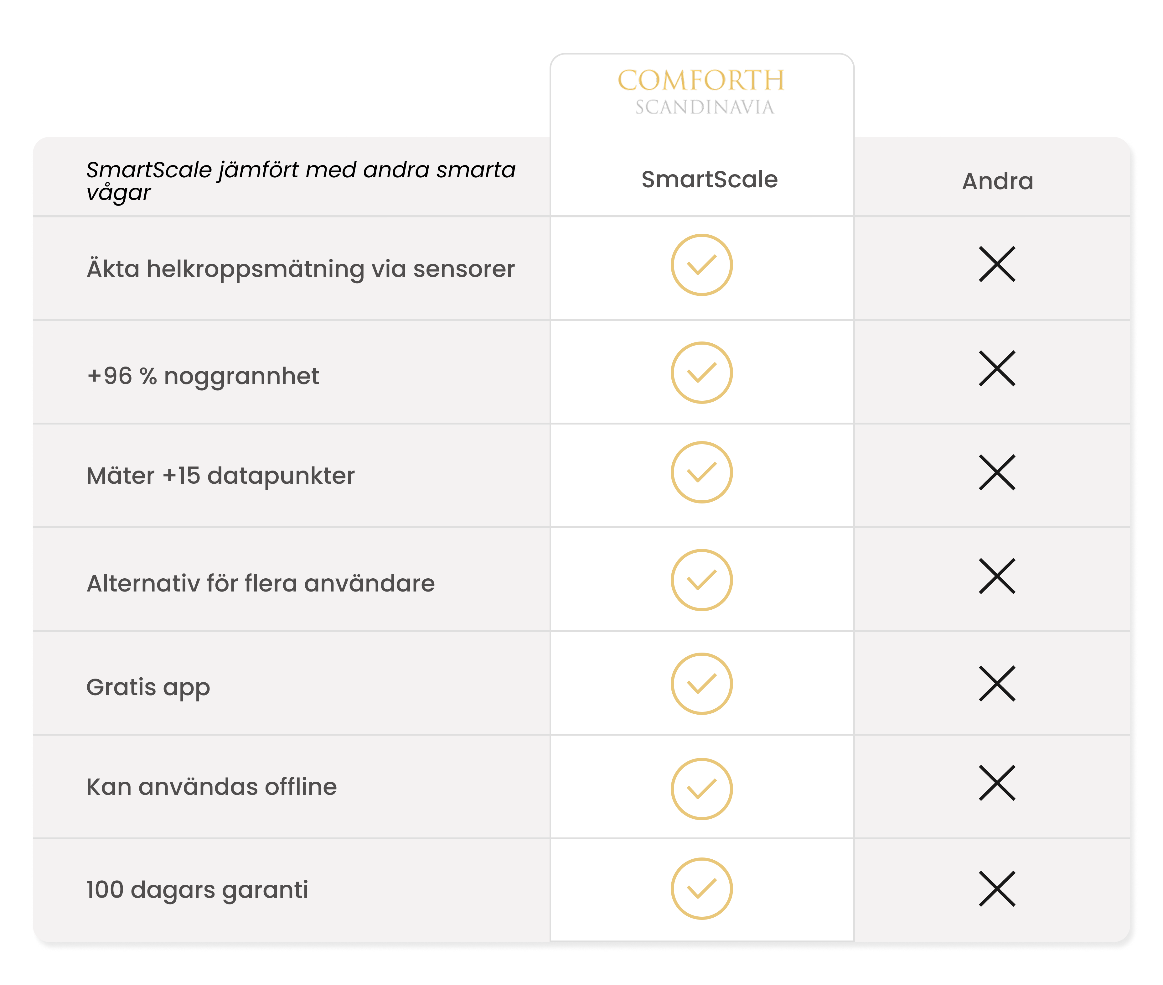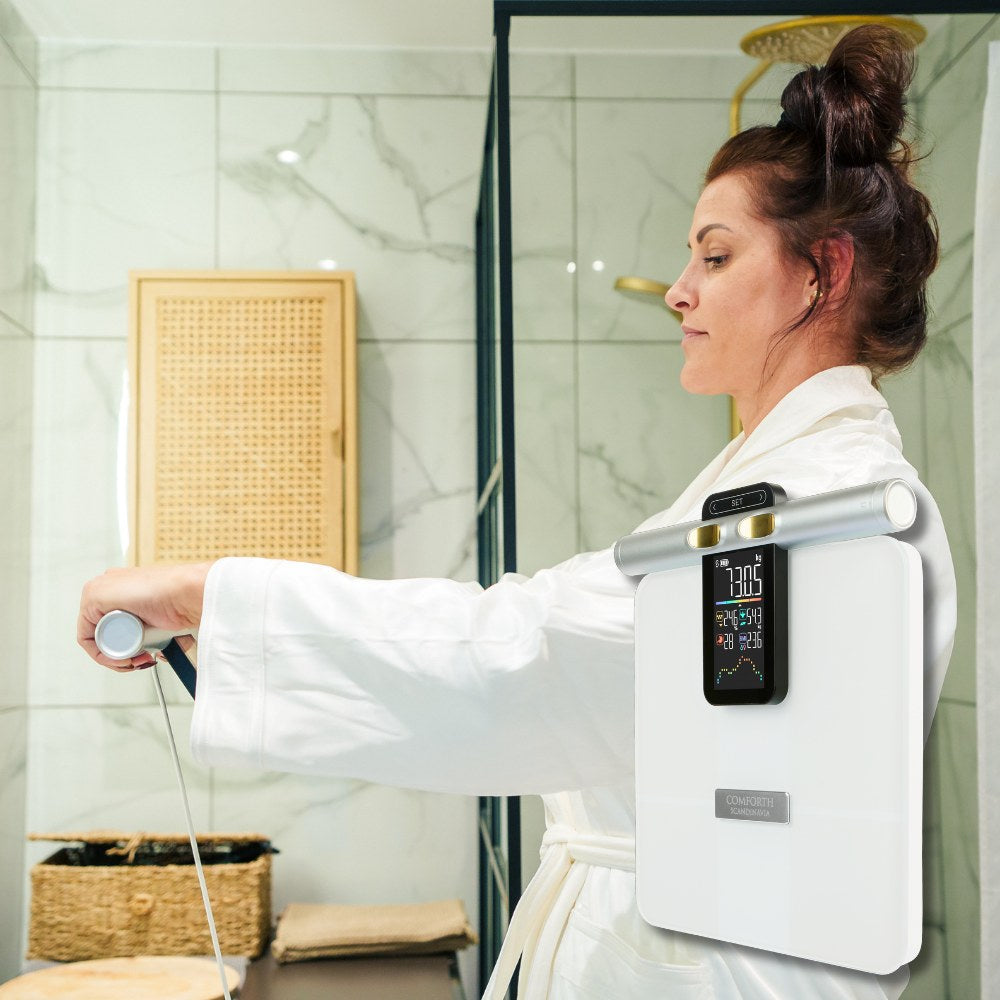 Comforth SmartScale är din personliga kroppsscanner som ger dig samma typ av kroppsanalyser som normalt kräver professionell utrustning. På bara några sekunder får du en komplett överblick över din kroppssammansättning direkt hemma.