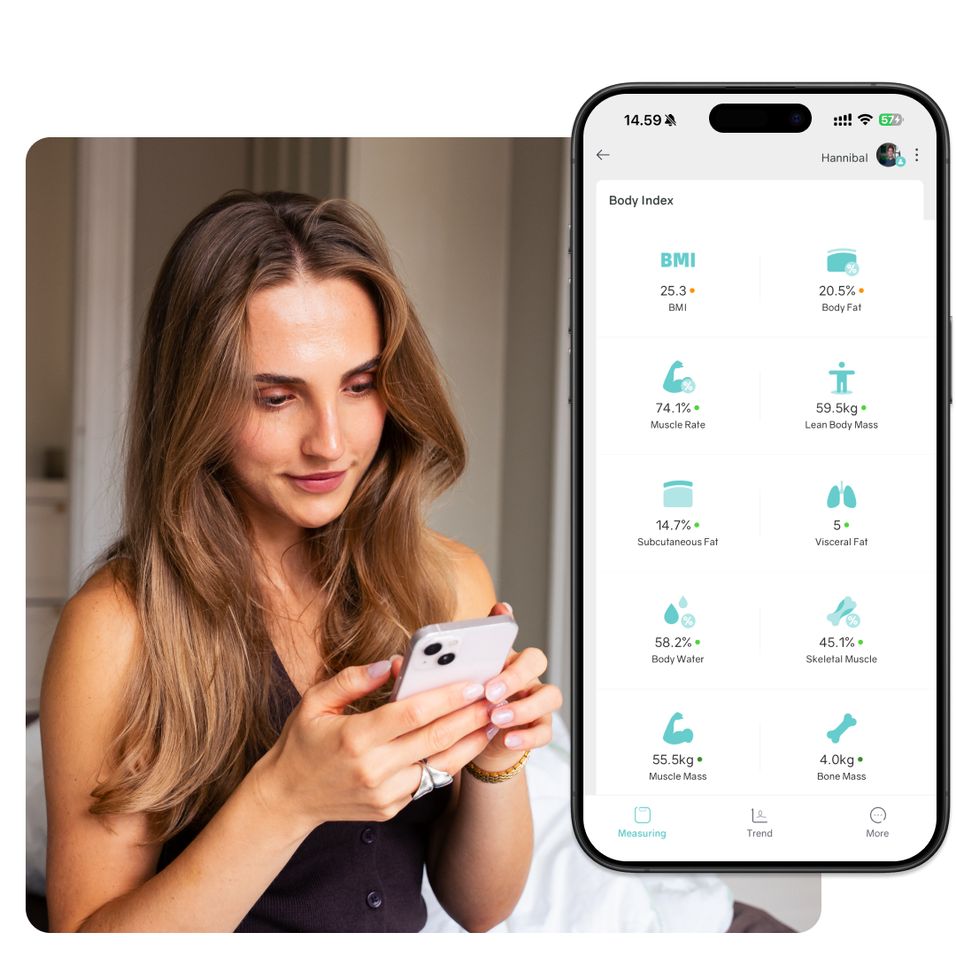 SmartScale ger dig exakta mätningar av fettprocent, muskelmassa och kroppssammansättning – så att du vet vad som faktiskt händer i din kropp.